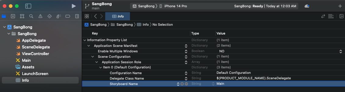 Info.plist에 진입해서 열고 열다보면 Stroyboard Name이 있는데...
