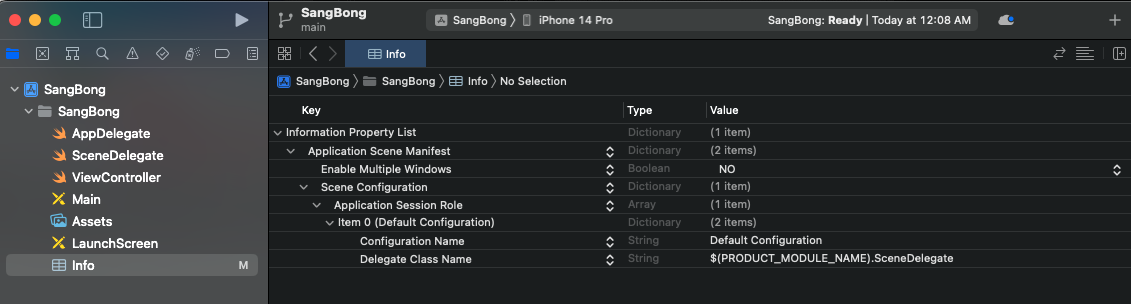 이런 식으로 진입을 하게 되는데 왼쪽 상단에 있는 Info.plist를 들어가준다.