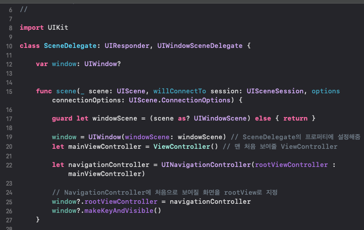 이후 SceneDelegate에 가서 처음 보여줄 ViewController를 설정해주면 된다.