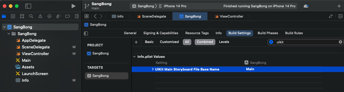 다음으로는 프로젝트 TARGETS -> Build Settings -> UIKit Main Storyboard File Base Name에서 Main을 제거하자
