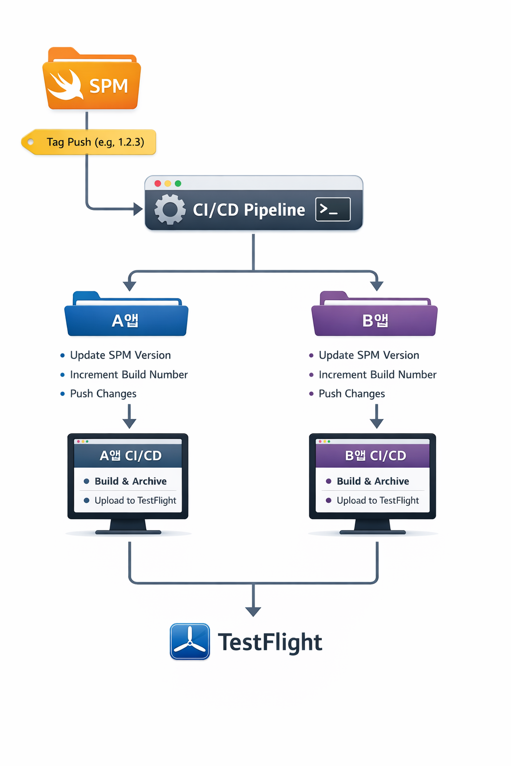 SPM 수정 -> 커밋 & 푸시 & 태그 발행 -> A앱 태그 적용 및 빌드 & 아카이브 -> B앱 태그 적용 및 빌드 & 아카이브